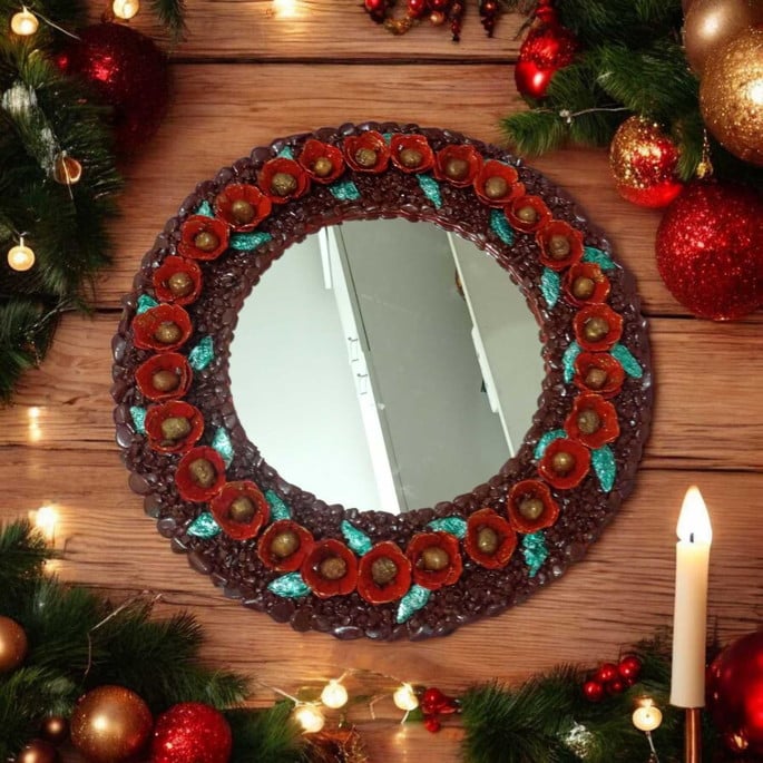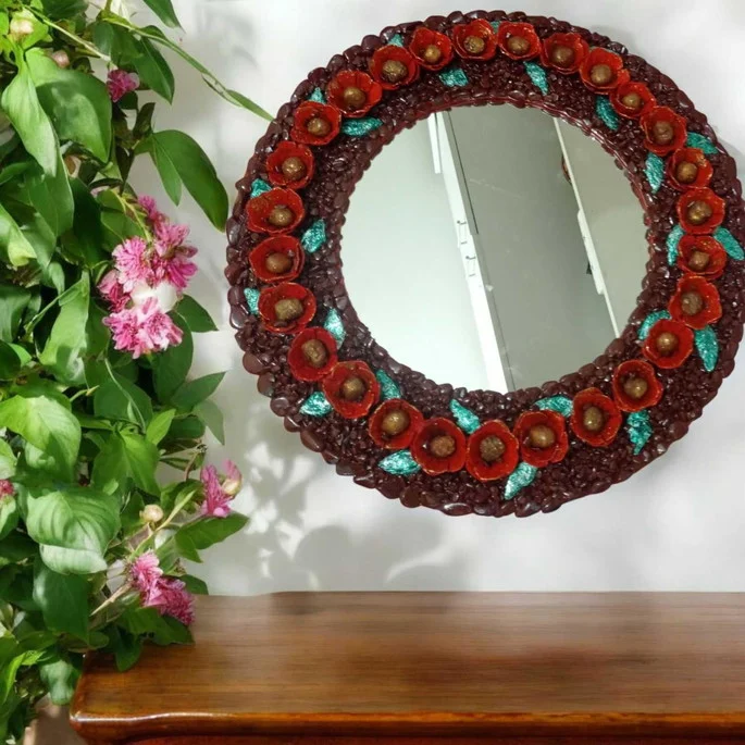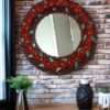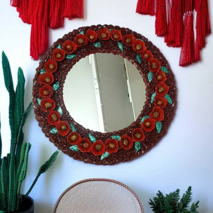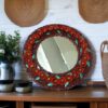 Espelho mandala primavera rosas artesanais e pedras jaspe vermelho.